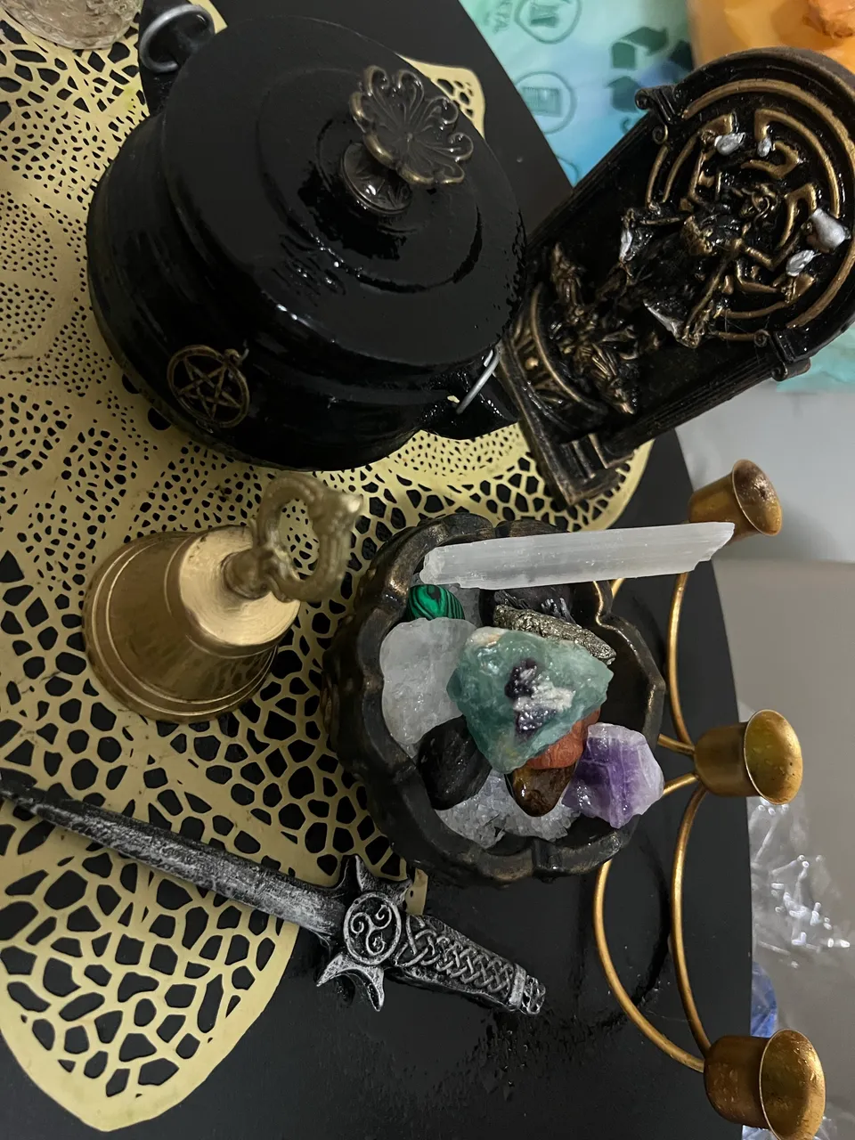 Kit completo para bruxaria! Inclui caldeirão, sino, adaga, cristais e outros itens essenciais para seus rituais e práticas mágicas. Ideal para iniciantes e praticantes, fora isso ainda vem um pacote de 1kg de velas brancas e uma caixa com muitas variedades de incensos