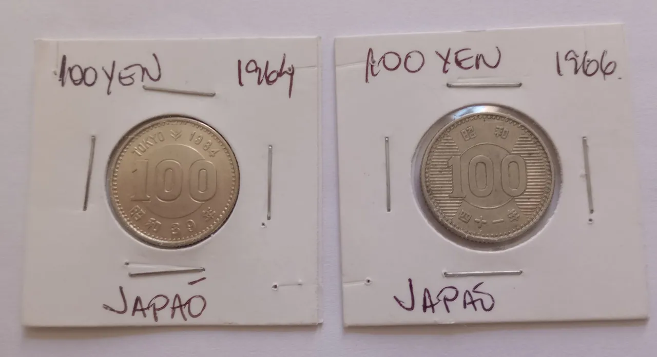 Moedas antigas de prata do Japão, de 100 Yen, anos de 1.964 e 1.966, prata 0,600, peso 4,8 gramas cada moeda. Estado soberba. Valor do lote 180,00 ou 90,00 cada uma.