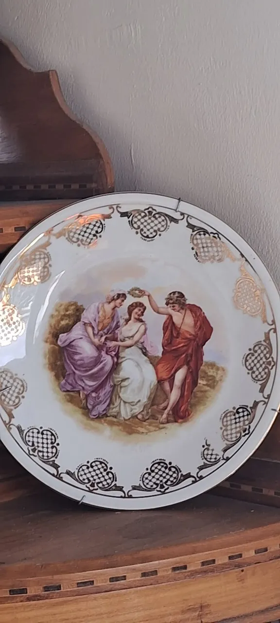 Lindo prato antigo com detalhes dourados e uma pintura encantadora. Perfeito para colecionadores e amantes de antiguidades. Uma peça única para decorar ou presentear.