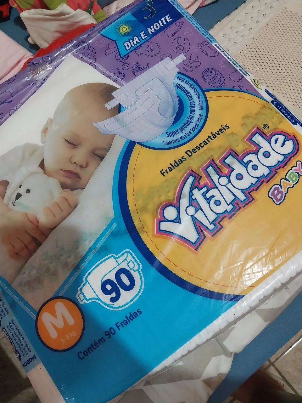 Fraldas descartáveis Vitalidade Baby Dia e Noite, com cobertura macia e toque suave, para o conforto do seu bebê. Pacote com 90 fraldas, tamanho M (5-9 kg). Garanta noites tranquilas e dias protegidos!