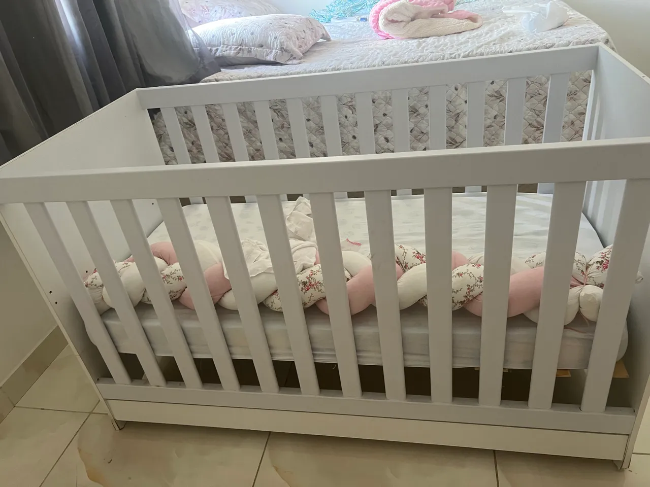 Lindo berço branco com colchão incluso, perfeito para o conforto do seu bebê. Design moderno e seguro para noites tranquilas.