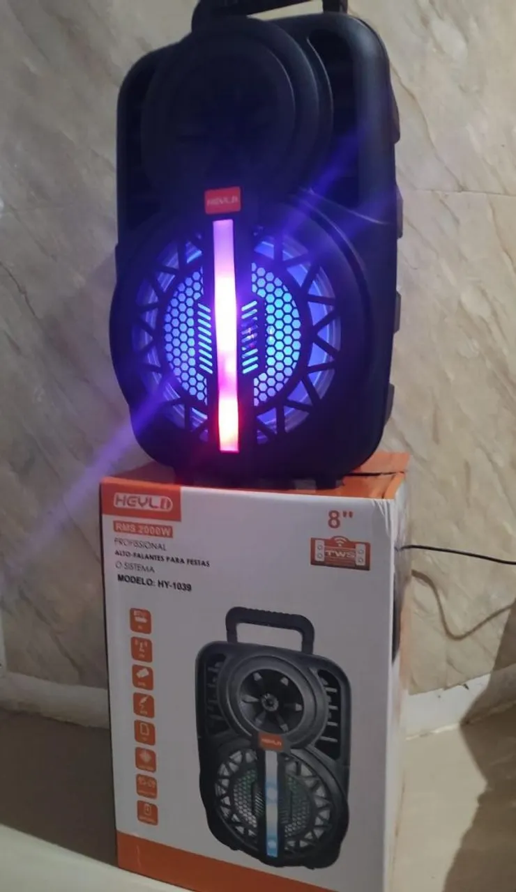 Caixa de som Bluetooth profissional com 8 polegadas e 2000W RMS de potência. Ideal para festas e eventos. Possui sistema de som de alta qualidade e luzes LED. Aproveite!