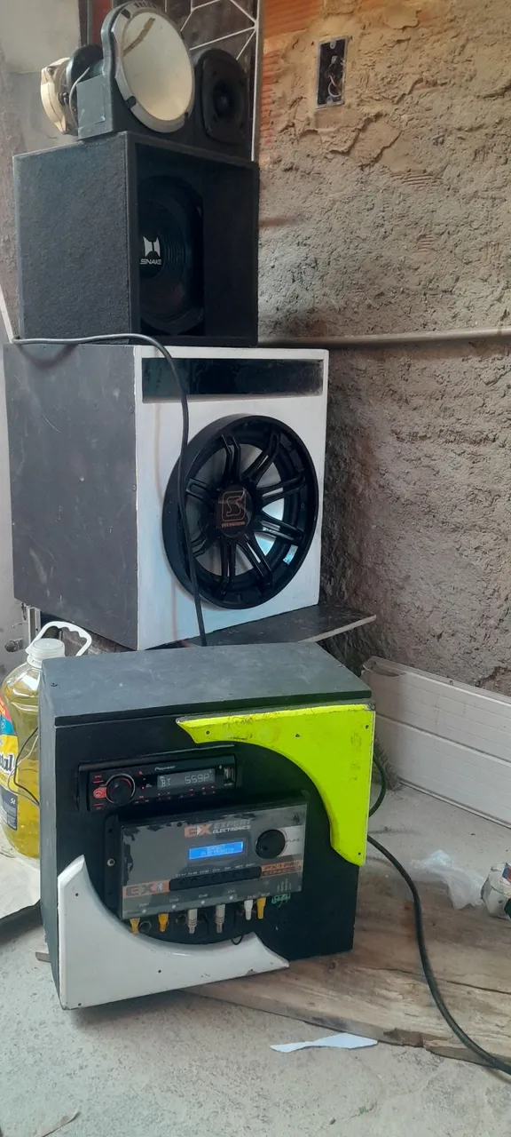 Som top. Grave de 12 450 rms bobina dupla, Médio de 10 ,350rms ,Corneta D250x selenium ,Twitter St 200 selenium, Módulo soundigital 800x4 novo Módulo stetsom 400x4 novo Fonte usina semi nova 60Ap Toca cd pioneer semi novo.
