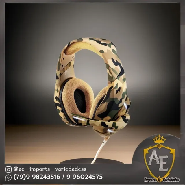Headset gamer camuflado, design moderno e confortável. Ideal para longas sessões de jogos. Experiência sonora imersiva e microfone de alta qualidade para comunicação clara.