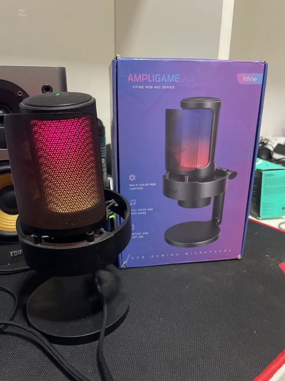 Microfone Fifine Ampligame A8, ideal para gamers e criadores de conteúdo! Com iluminação RGB vibrante e qualidade de áudio excepcional, este microfone USB garante gravações nítidas e claras. Design moderno e fácil de usar, perfeito para streaming e comunicação online.