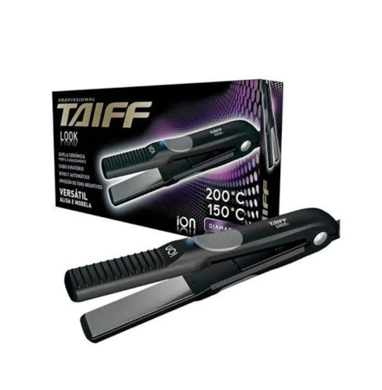 Prancha de cabelo Taiff Look Pro, com tecnologia de íons negativos e placas de cerâmica, alisa e modela os cabelos com perfeição. Temperaturas de 150° e 200°.