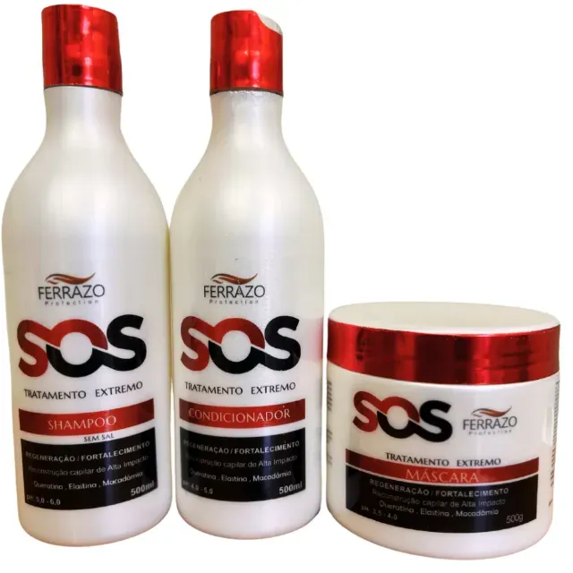 Kit Ferrazo SOS: a solução completa para reconstrução capilar de alta performance! Shampoo, condicionador e máscara, formulados com queratina, elastina e macadâmia, para um tratamento extremo que revitaliza e fortalece seus cabelos. Experimente a transformação!