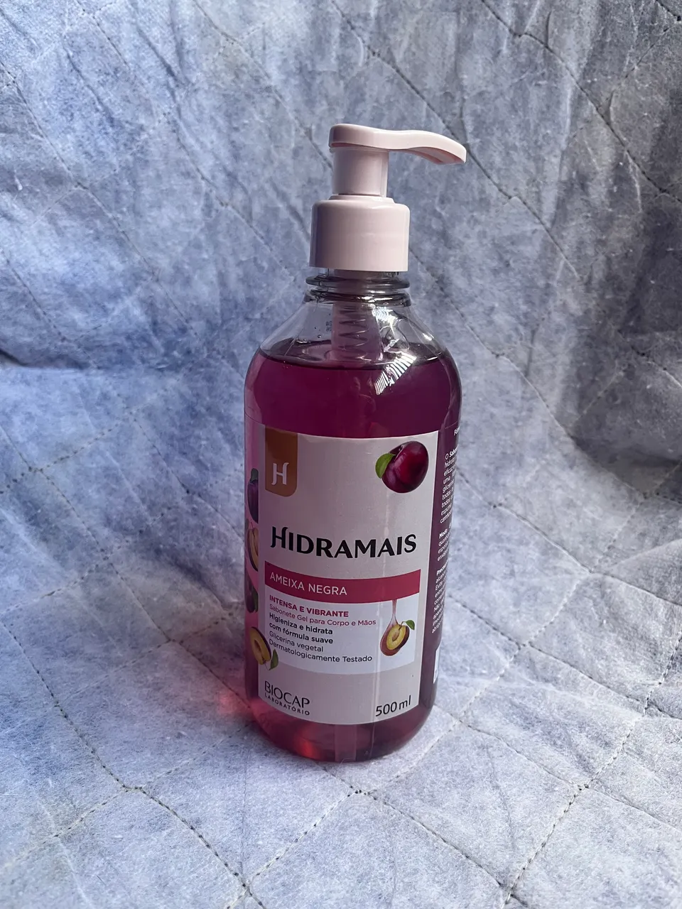 Sabonete em gel Hidramais Ameixa Negra, intenso e vibrante, para corpo e mãos. Higieniza e hidrata com fórmula suave e glicerina vegetal. Dermatologicamente testado. 500ml.