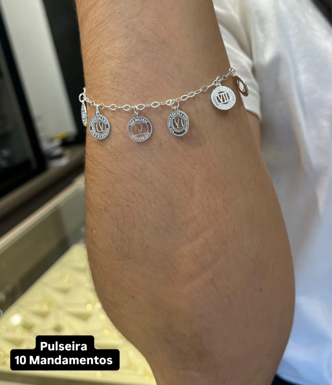 Linda pulseira em prata 925 com detalhes dos 10 mandamentos. Design moderno e elegante para complementar seu visual.