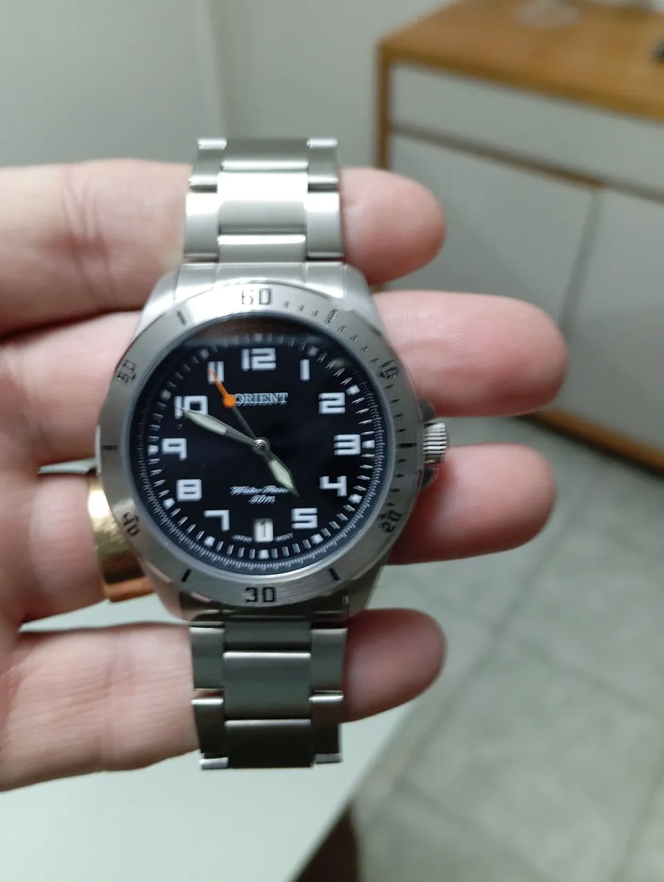 Relógio Orient com design moderno e elegante. Perfeito para o dia caixa em aço resistente a água.