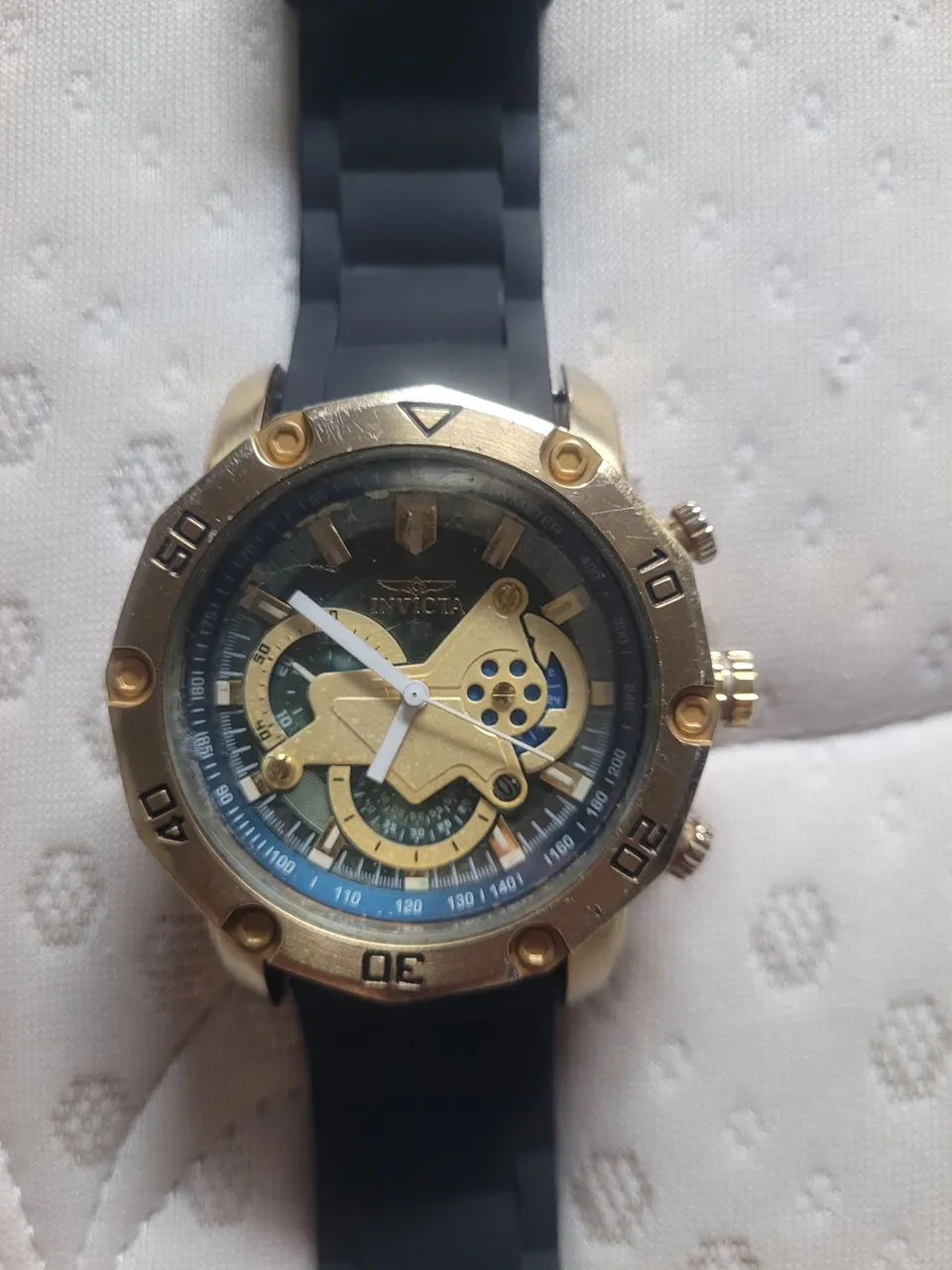 Relógio Invicta, design elegante e moderno, perfeito para complementar seu estilo. Com detalhes em dourado e pulseira preta, este relógio é um acessório que combina sofisticação e funcionalidade.
