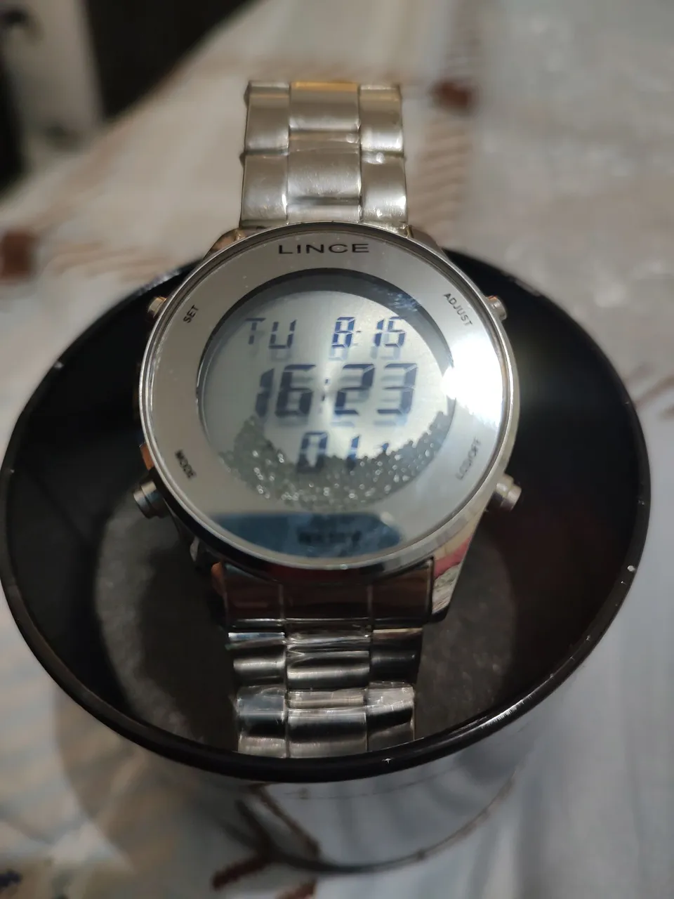 Relógio Lince Digital de pulso com pulseira em aço inoxidável. Design moderno e funcional, ideal para o dia a dia.