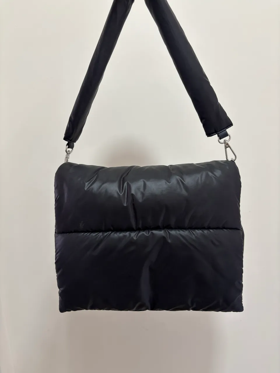 Bolsa de ombro preta, com design acolchoado, ideal para um visual moderno e confortável.