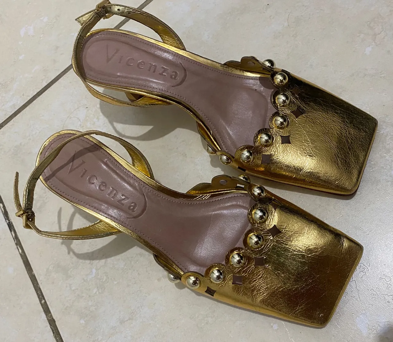Sandália dourada Vicenza, ideal para adicionar um toque de glamour ao seu visual. Design elegante e confortável, perfeita para diversas ocasiões.