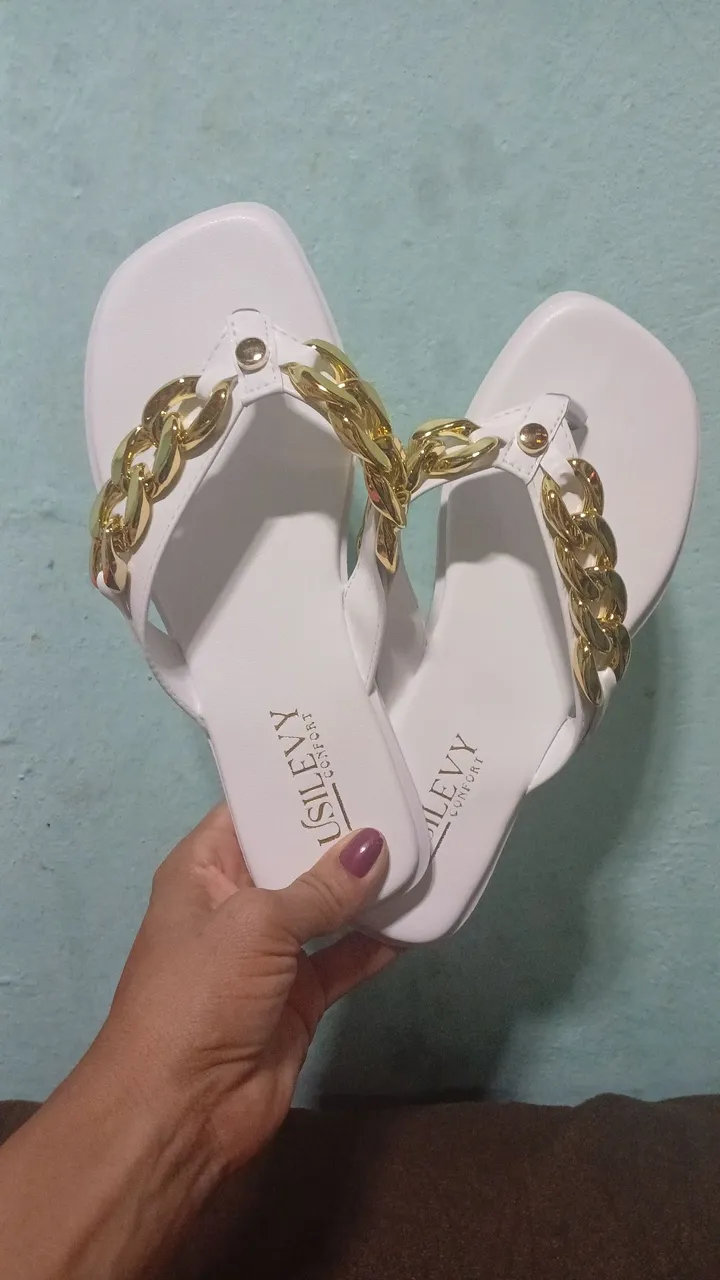 Sandália feminina branca com detalhes dourados. Conforto e estilo para seus pés!