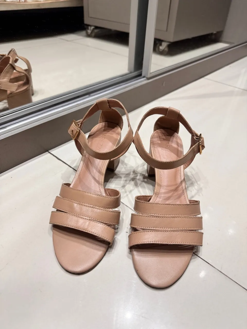 Sandália bege elegante, em couro,com tiras finas e salto bloco confortável. Perfeita para diversas ocasiões!