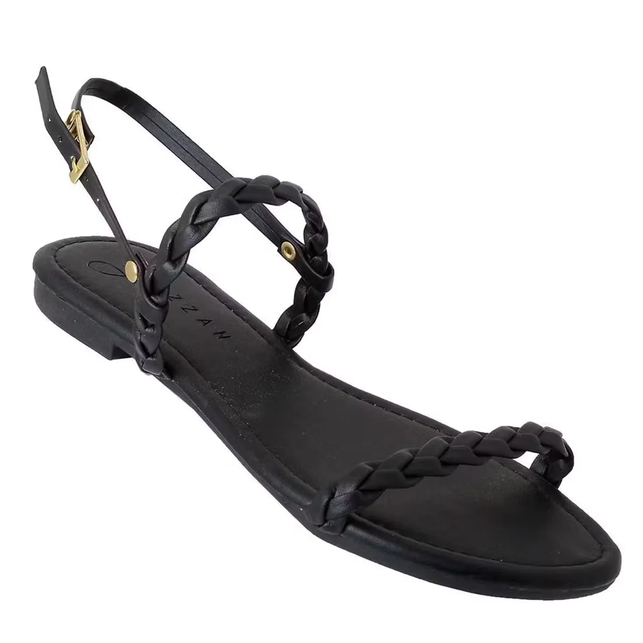 Sandália rasteirinha preta com detalhes trançados, ideal para looks casuais e confortáveis. Design moderno e elegante para diversas ocasiões.