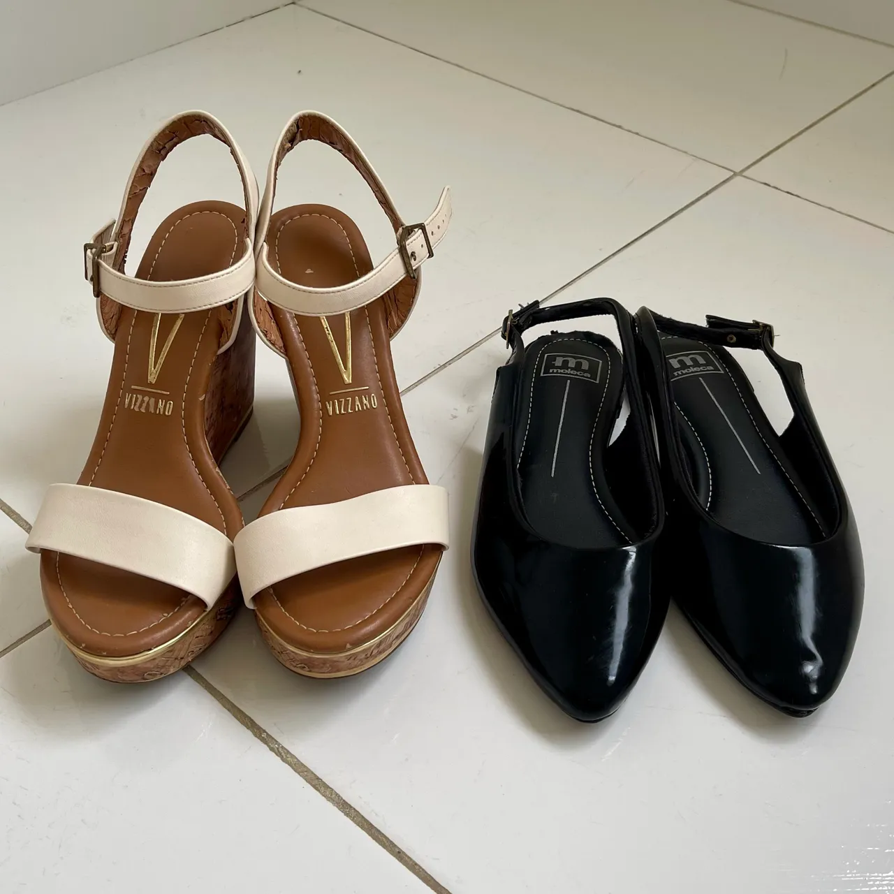 1 Sandália Anabela Vizzano off-white com salto cortiça e fechamento em fivela. Muito leve e confortável + 1 Sapatilha da marca Moleca preta verniz modelo slingback com bico fino. Ambas tamanho 37. Possuem marcas de uso conforme mostra nas fotos. Para mais informações, fale comigo pelos comentários!