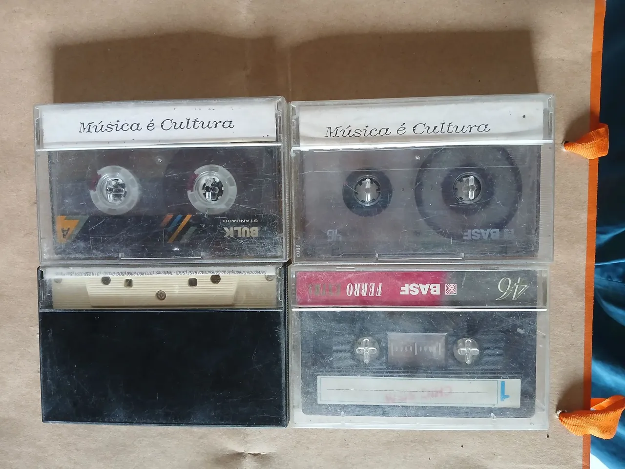 Cassetes musicais com a frase "Música é Cultura". São 4 fitas k7 de Leandro e Leonardo.