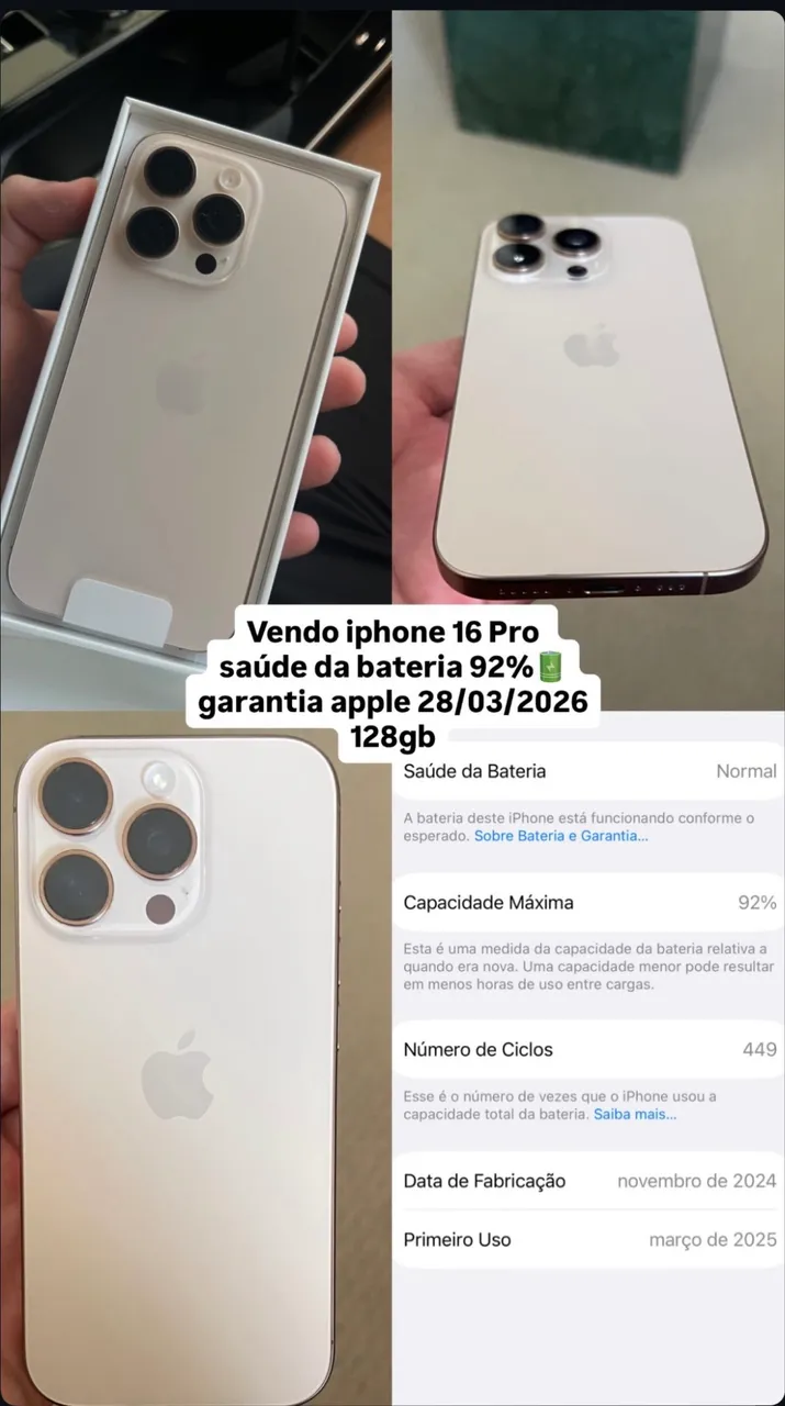Experimente a excelência com o iPhone 16 Pro! Este smartphone de última geração oferece desempenho impecável e design sofisticado. Com 128GB de armazenamento, você terá espaço de sobra para suas fotos, vídeos e aplicativos. A bateria com 92% de saúde garante longa duração, e a garantia Apple até 28/03/2026 proporciona tranquilidade. Aproveite a tecnologia de ponta e eleve sua experiência móvel!