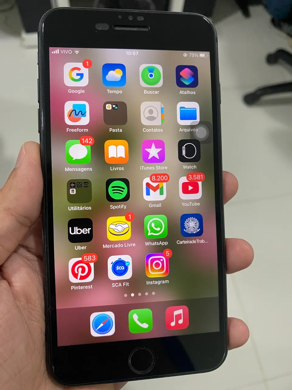 iPhone 8 Plus preto com 64GB de armazenamento! Em excelente estado de conservação, tudo funcionando perfeitamente.