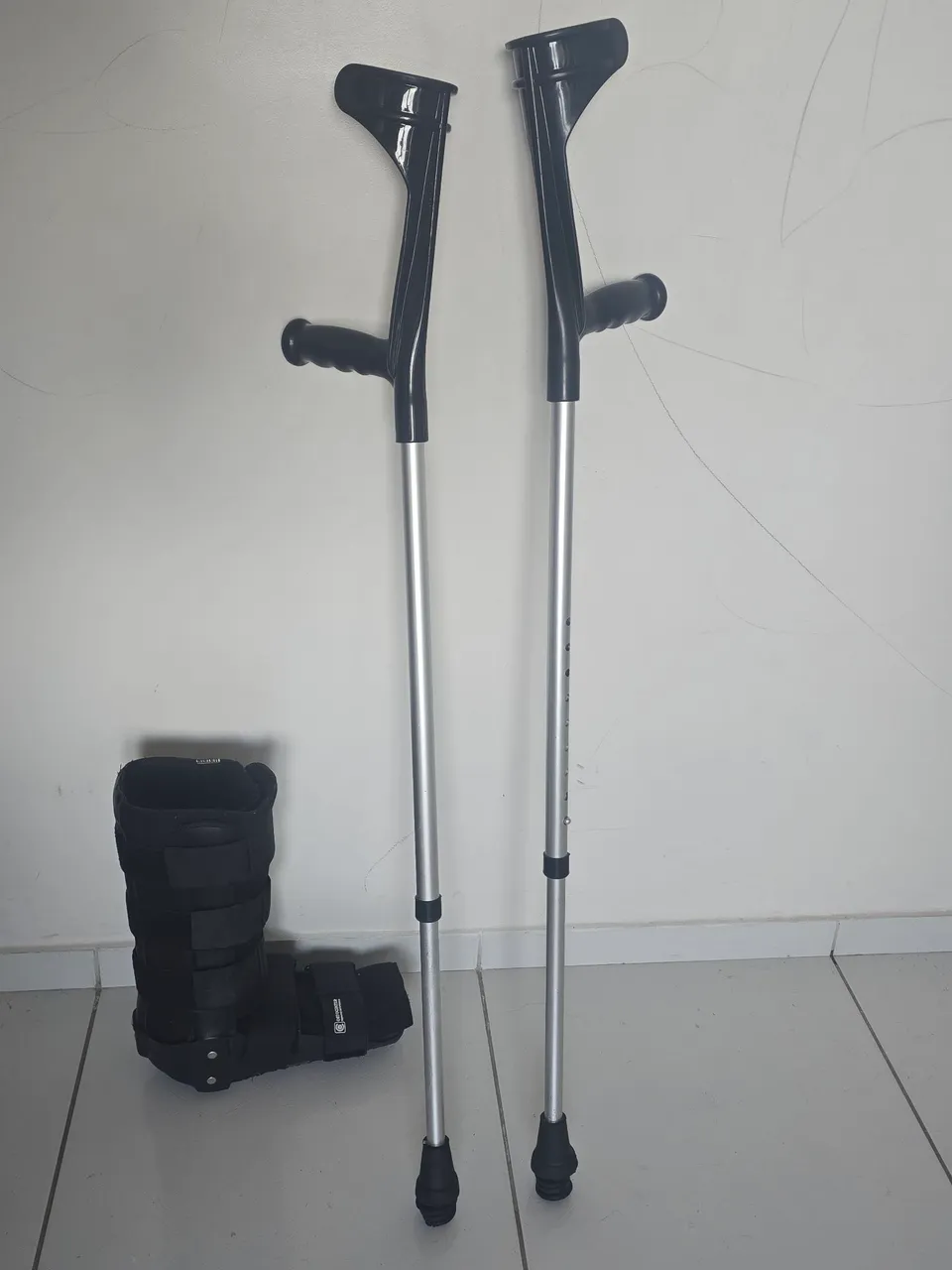 Muletas e bota ortopédica, ideais para auxiliar na recuperação de lesões. Conforto e segurança para você se locomover com tranquilidade!