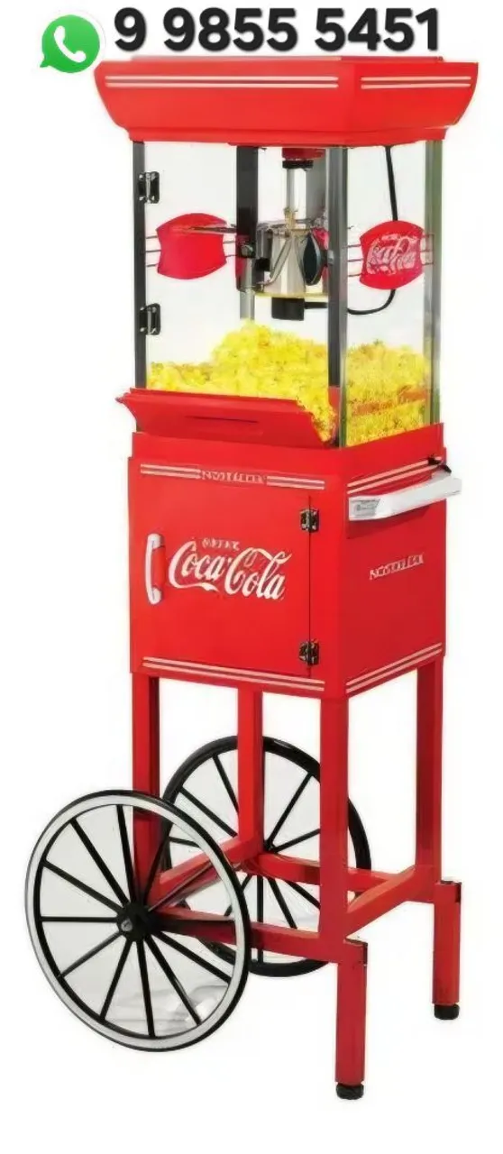Máquina de pipoca com design retrô da Coca-Cola, ideal para eventos e comércios. Prepare pipocas deliciosas de forma rápida e eficiente!