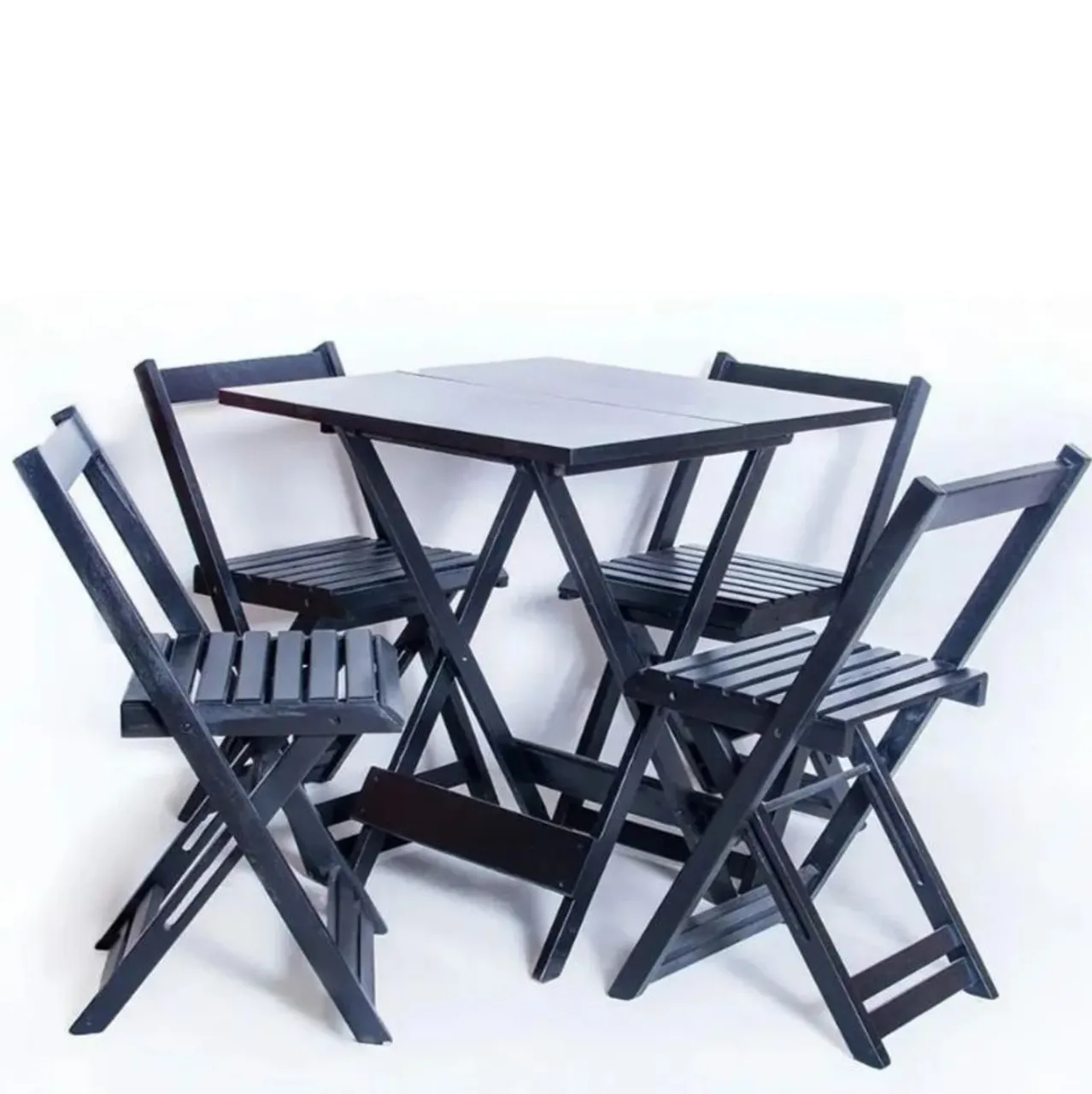 6 jogos de mesas de madeira cor preta acompanhando 4 Cardeiras, novos e sem marcas de uso.