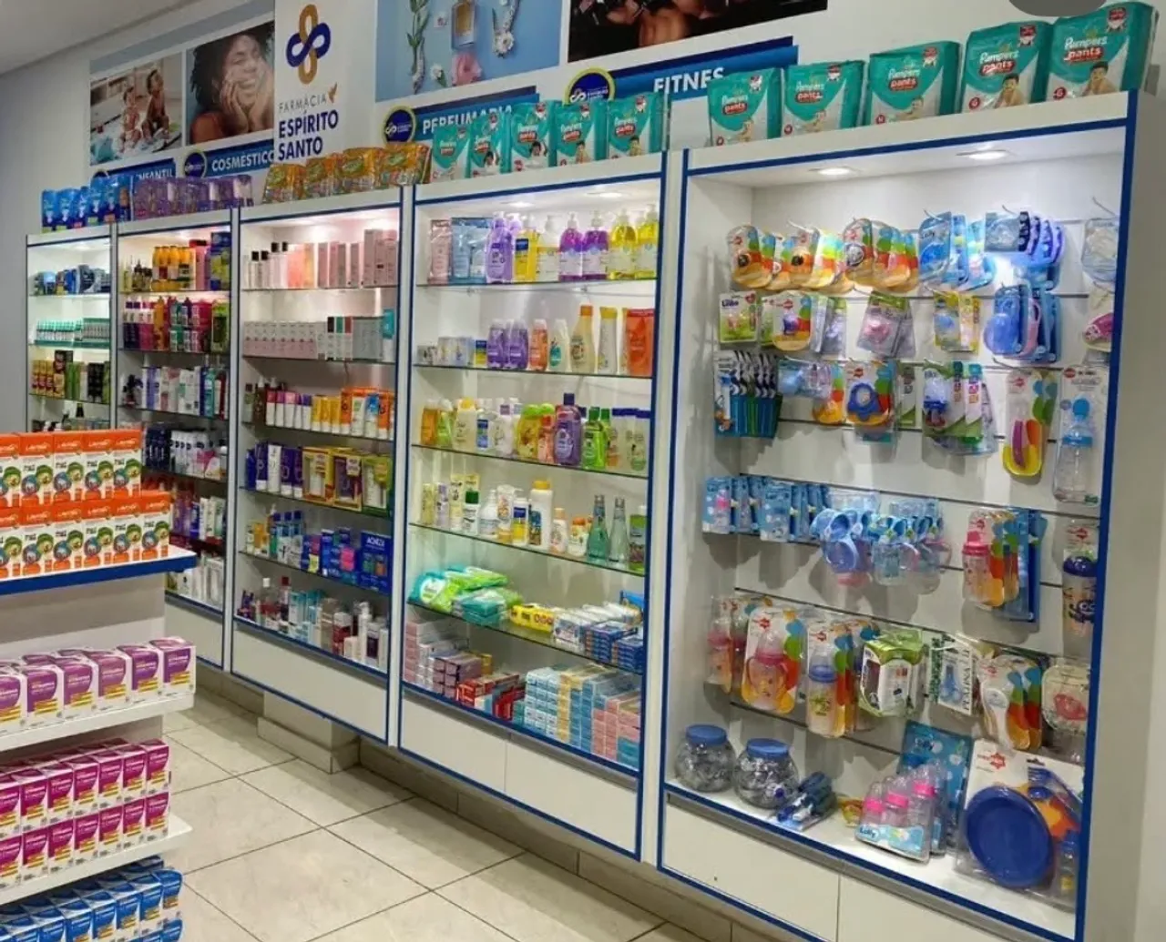 Estante toda em MDF perfeita para exposição de produtos, essa estante foi usada para farmácia mais poder ser usada para outros ramos tb, muito boa para expor produtos como cosméticos, perfumaria entre outros