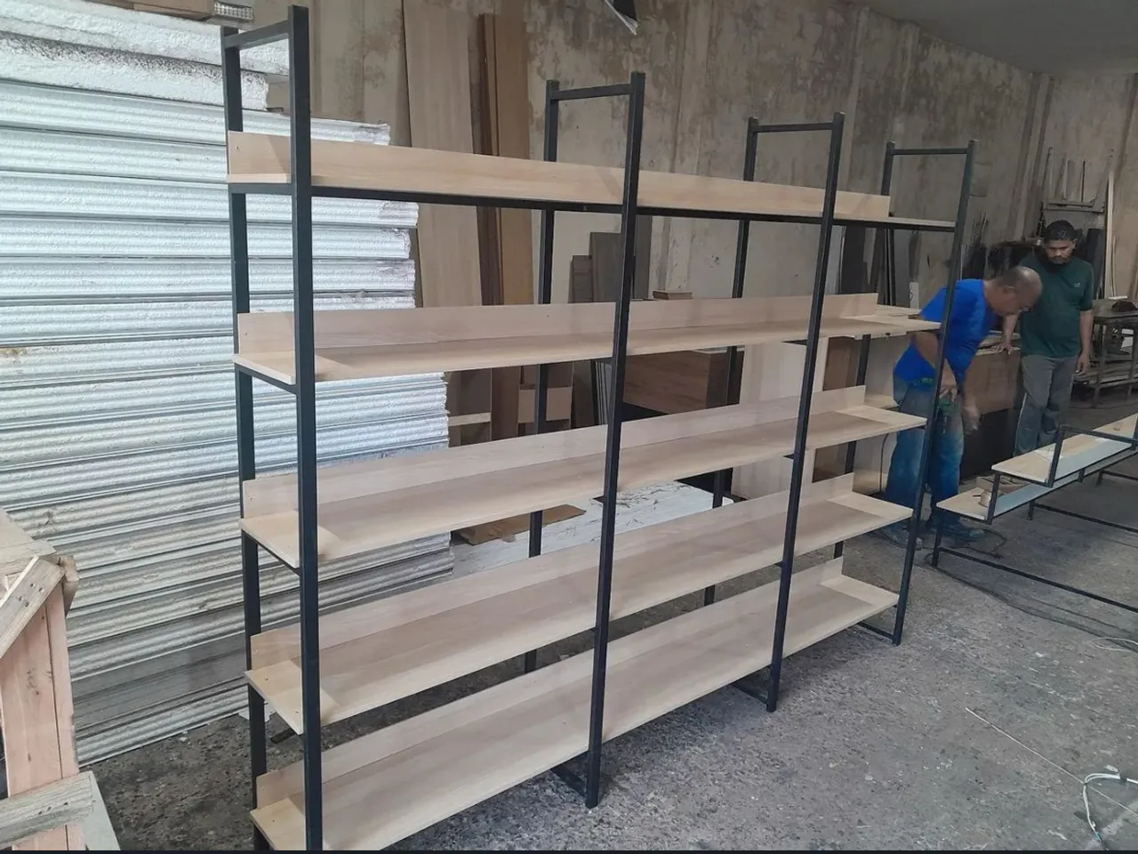 Expositor/Prateleira de aço resistente com prateleiras em madeira. Ideal para otimizar o espaço e organizar seus produtos com elegância e praticidade. ORÇAMENTOS VIA WHATSAPP