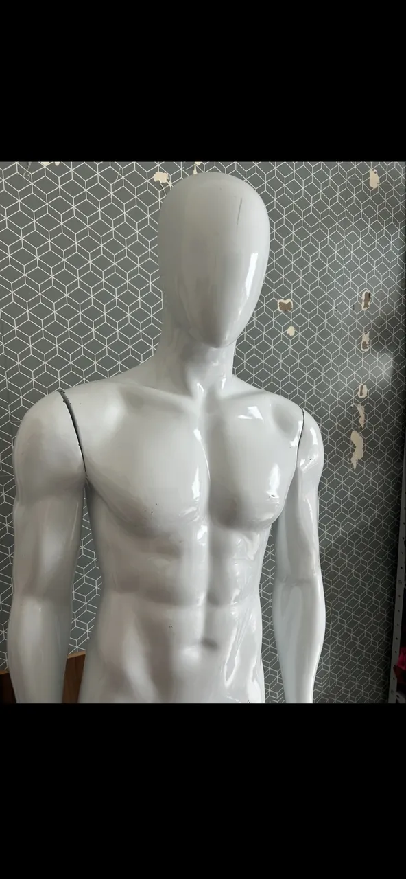 Manequim masculino fibra branco, ideal para exposição de roupas em lojas. Design moderno e elegante.