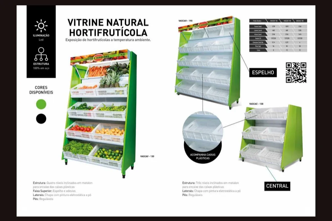 Vitrine verdureira nova, ideal para expor seus produtos de forma organizada e atrativa. Possui 12 caixas plásticas para facilitar a disposição dos alimentos. Iluminação em LED e estrutura 100% em aço.