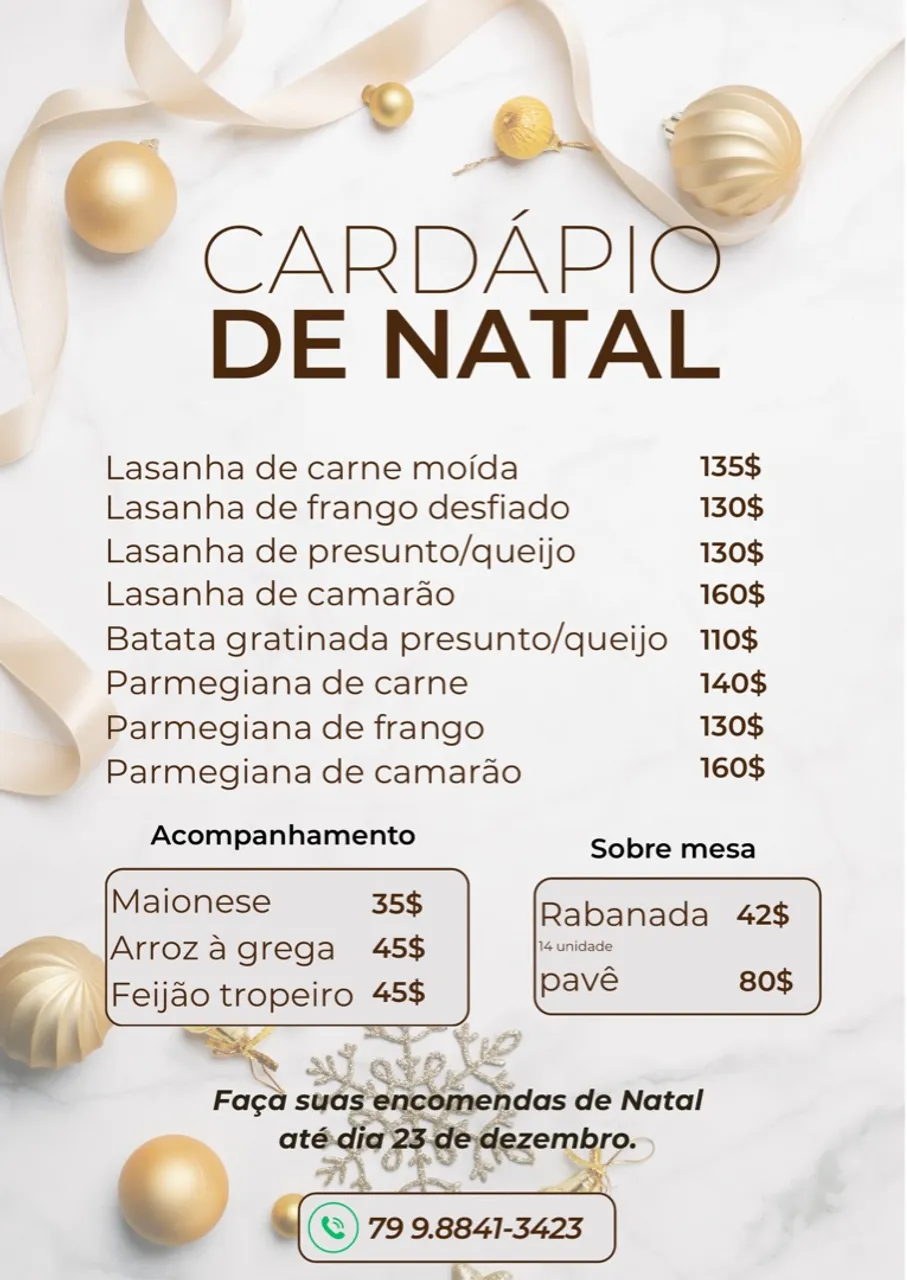 Celebre o Natal com um cardápio delicioso e variado! Oferecemos lasanhas, parmegianas, acompanhamentos e sobremesas que vão encantar seus convidados. Faça sua encomenda e garanta uma ceia inesquecível!