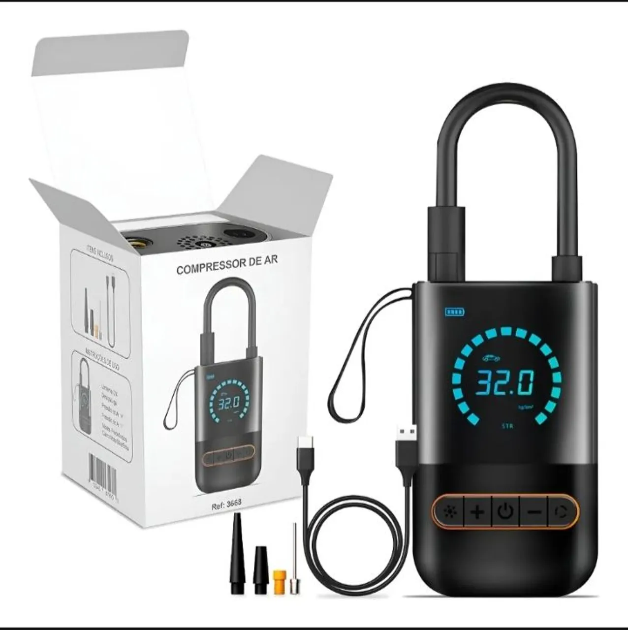 Acompanha acessórios para enchimento de bolas de futebol, pneus de carros e motos entre outros.