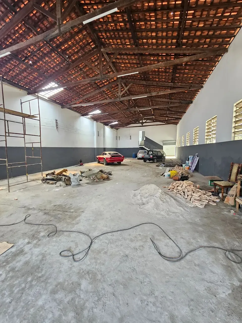 Galpão com aproximadamente 410m2, lado da sombra, com poço artesiano, WC social, corredor lateral, área no fundo livre, mezanino com WC, porta automática.
