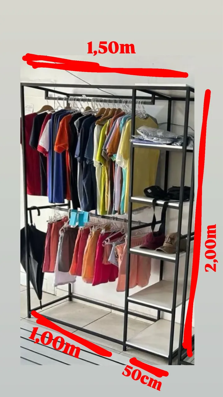 Organize suas roupas com estilo! Arara com prateleiras perfeita para otimizar seu espaço e deixar tudo ao seu alcance. Design moderno e funcional, ideal para quartos, closets e lojas. Leve já!