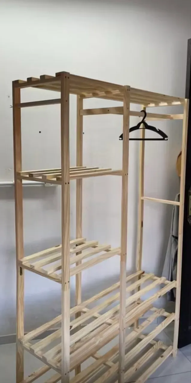 Cabideiro de madeira, ideal para organizar suas roupas com praticidade e estilo. Design moderno e funcional, perfeito para otimizar o espaço do seu quarto ou closet.