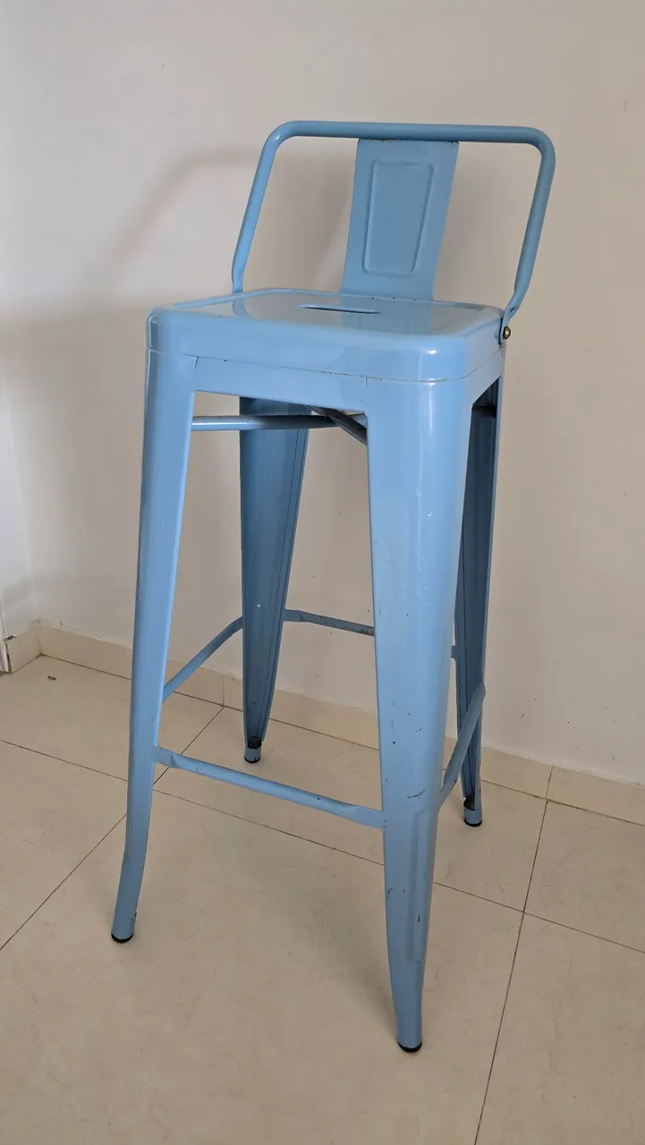 Duas banquetas de aço azul claro, com encosto de 84 cm de altura.