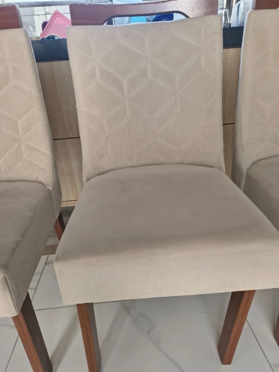Cadeira de jantar elegante e confortável para sua casa. Das 6 cadeiras 3 encontra-se em excelente estado, as outras 3 necessitam de reparos nas pernas. Estofados em bom estado em todas cadeiras.