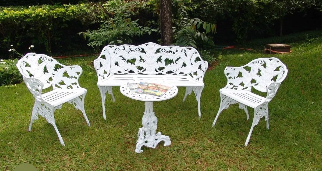 Conjunto de cadeiras de ferro branco perfeito para sua área externa! Design elegante e resistente para momentos de relaxamento e convívio. Só está disponível na cor verde as brancas não tenho mais mais está todo completo com a mesinha aí he pra resto da vida
