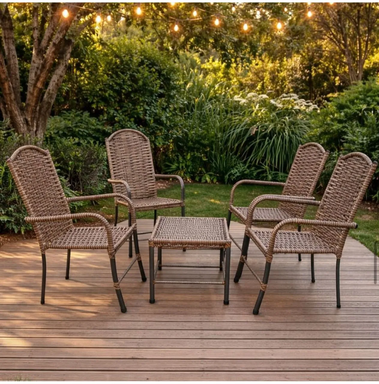 Conjunto perfeito para sua área de lazer! Cadeiras confortáveis e elegantes, com centro de mesa para um toque especial. Ideal para relaxar e receber convidados com estilo.