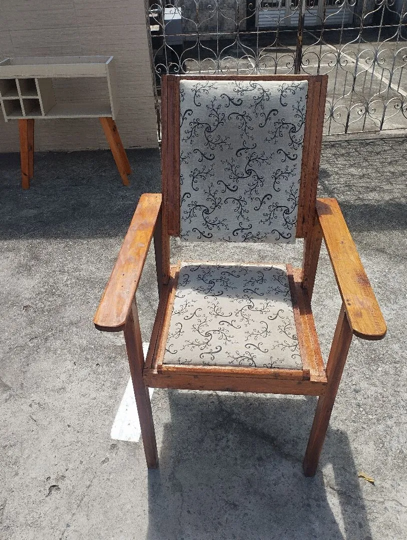 Poltrona de madeira maciça, com estofado confortável. Ideal para sala de estar, escritório ou varanda. Peça única, de excelente qualidade. Entre em contato para mais informações.