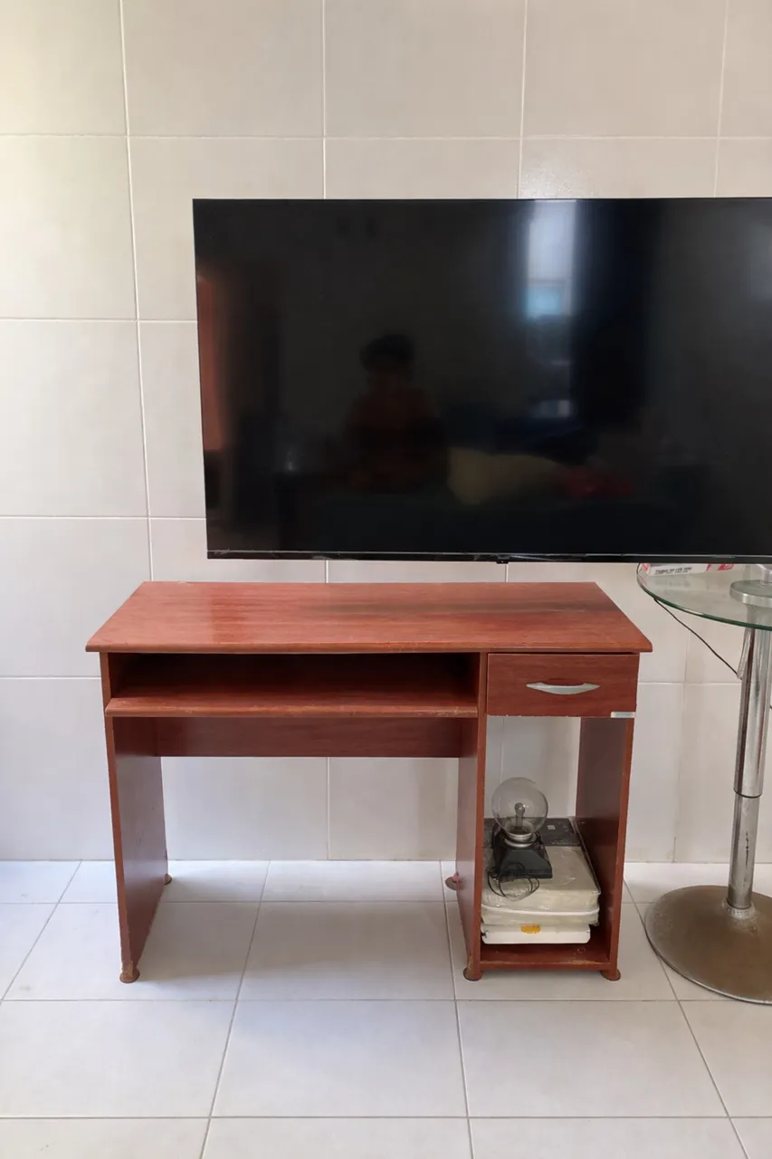 Bancada de madeira em bom estado, ideal para TV, computador ou estudos. Possui gaveta, prateleira central e nicho lateral, oferecendo bom espaço para organização. Estrutura firme e acabamento em madeira.