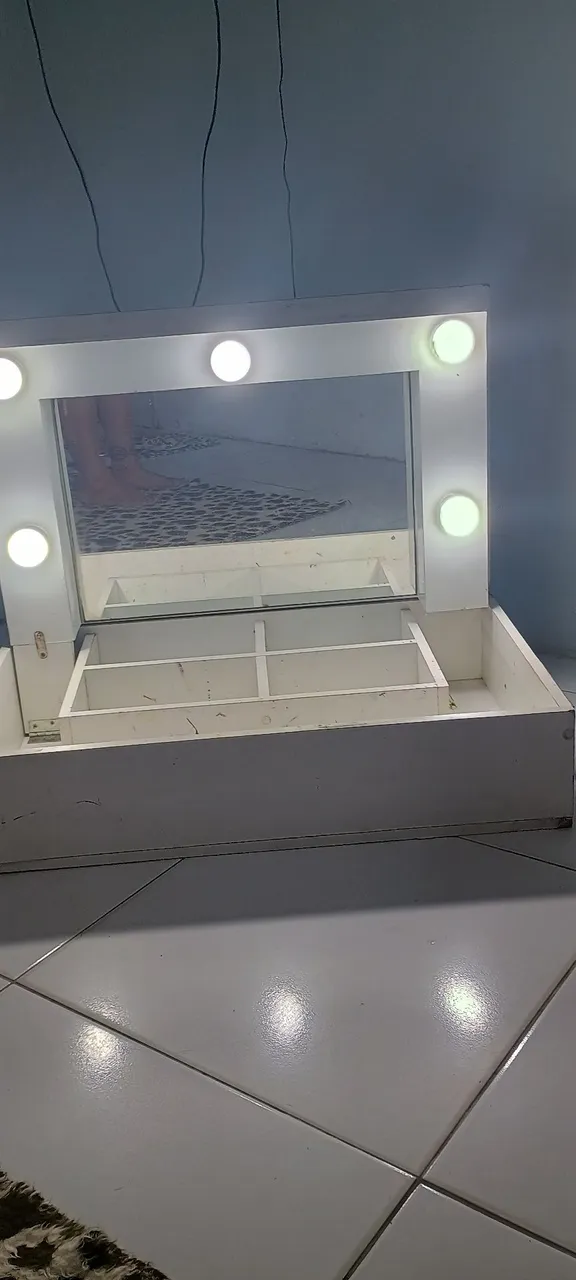 Charmoso camarim móvel com espelho e iluminação embutida. Ideal para organizar seus cosméticos e maquiagens, além de criar um ambiente perfeito para se preparar. Design funcional e elegante, perfeito para qualquer espaço!
