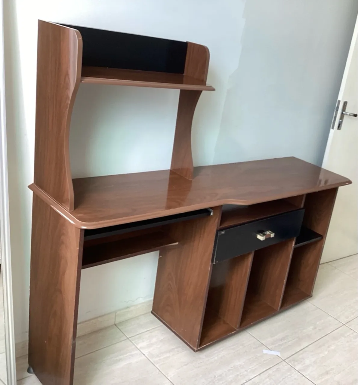 Linda escrivaninha com prateleira superior para organizar (ou impressora), puxador com espaço para teclado e gaveta para guardar seus pertences. Design funcional para comportar notebook, livros, ou o que desejar organizar no escritório ou quarto.