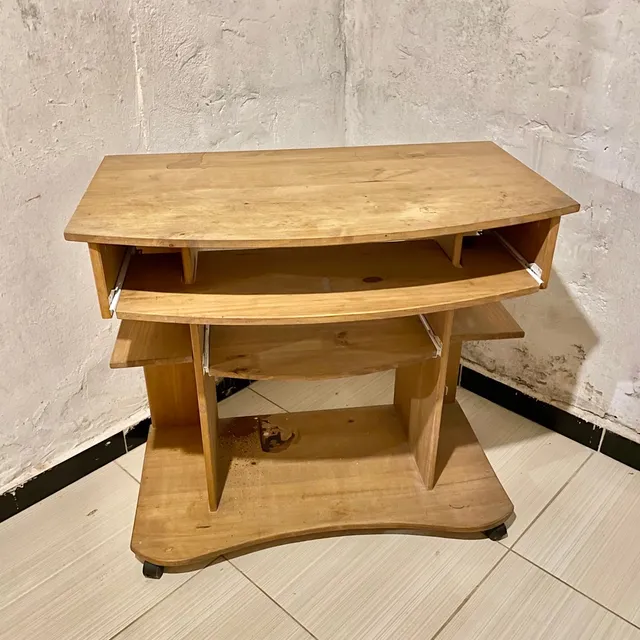 Mesa fabricada em madeira para computador. Com espaço deslizante para teclado, caixas de som, jogos, livros e outros acessórios.