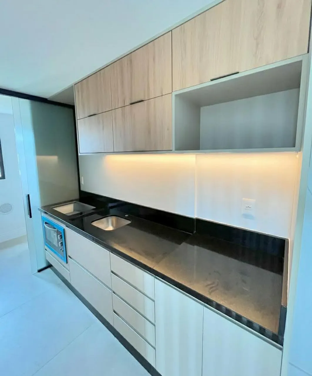 Linda cozinha planejada com armários . Design moderno e funcional, perfeita para otimizar o espaço. Ideal para quem busca organização e beleza.
