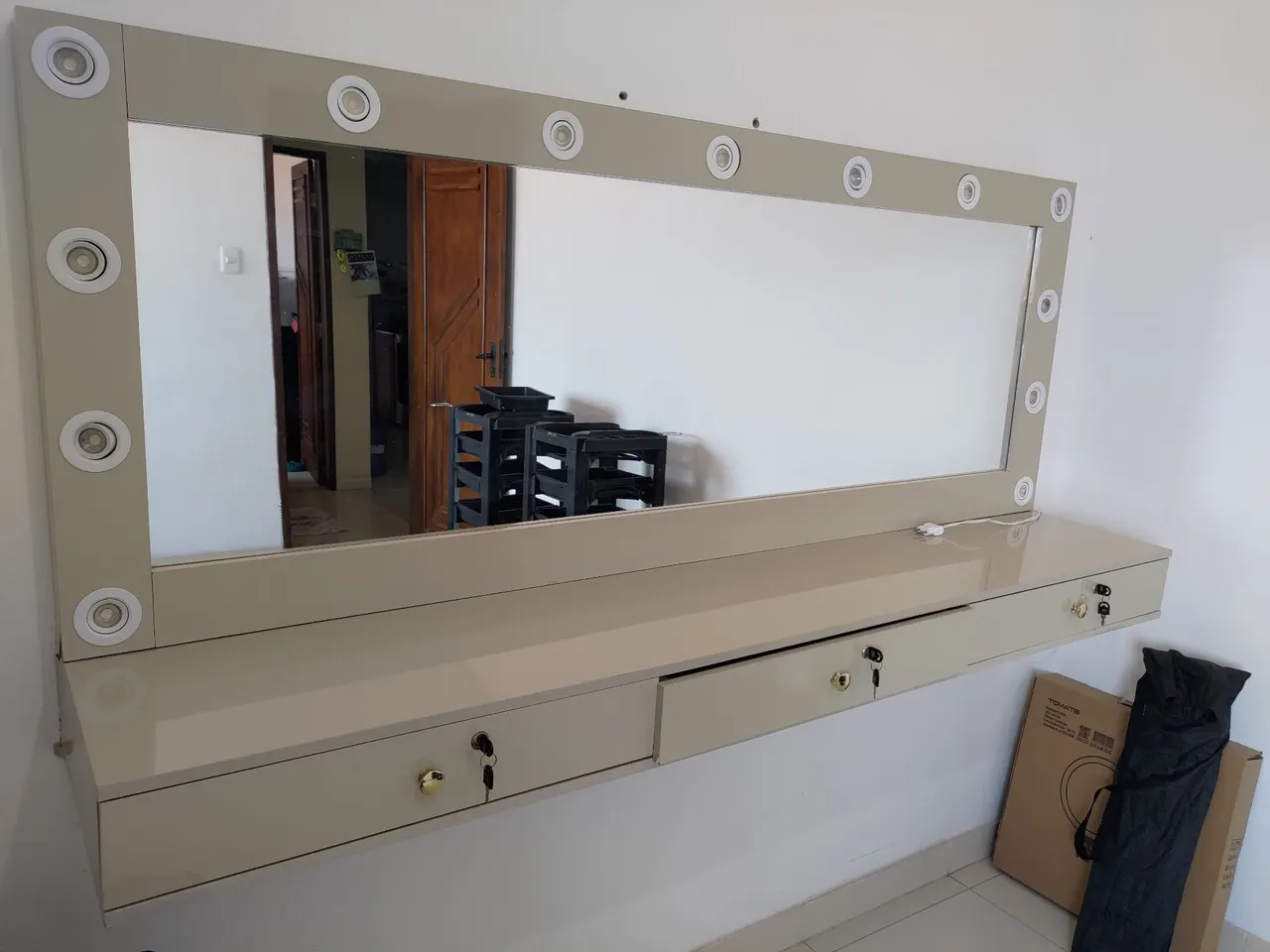 Penteadeira de 2 metros em MDF, perfeita para quem busca praticidade e elegância. Design moderno e funcional, com gavetas espaçosas e iluminação embutida para facilitar a sua rotina de beleza.