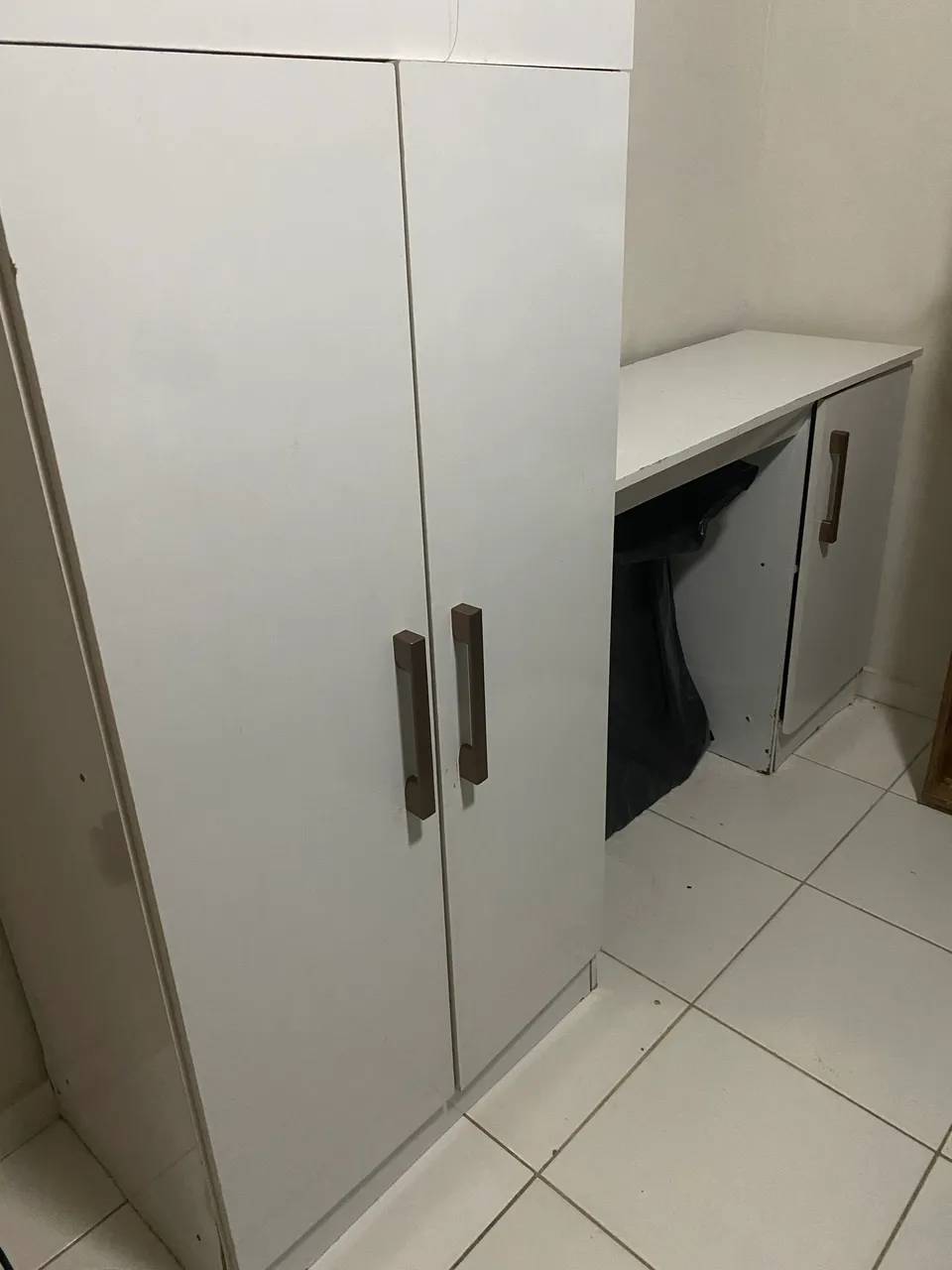 Conjunto de escrivaninha e armário em perfeito estado, ideal para otimizar seu espaço de trabalho ou estudo. Design moderno e funcional, perfeito para organizar seus pertences. Aproveite!