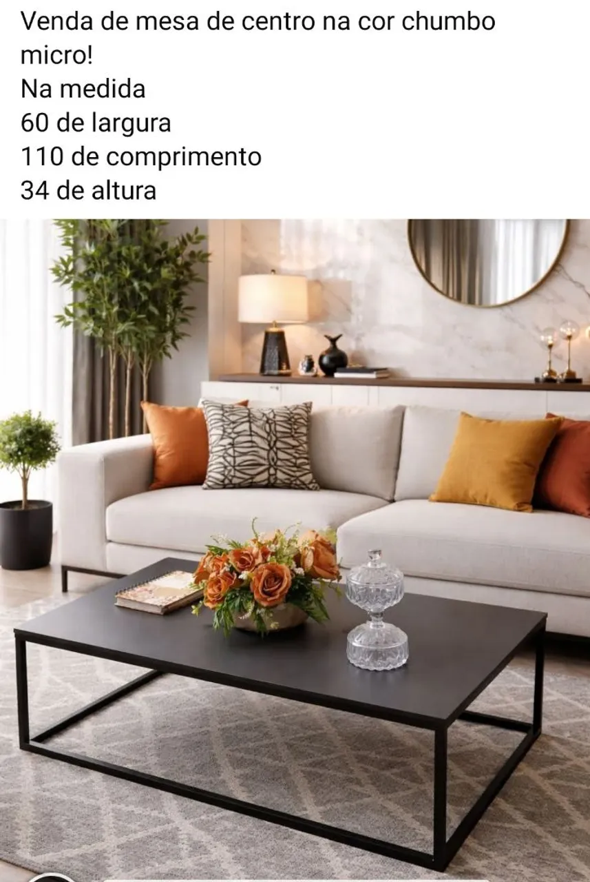 Linda mesa de centro na cor chumbo, design moderno e elegante para sua sala. Medidas ideais: 60cm de largura, 110cm de comprimento e 34cm de altura. Perfeita para complementar sua decoração!
